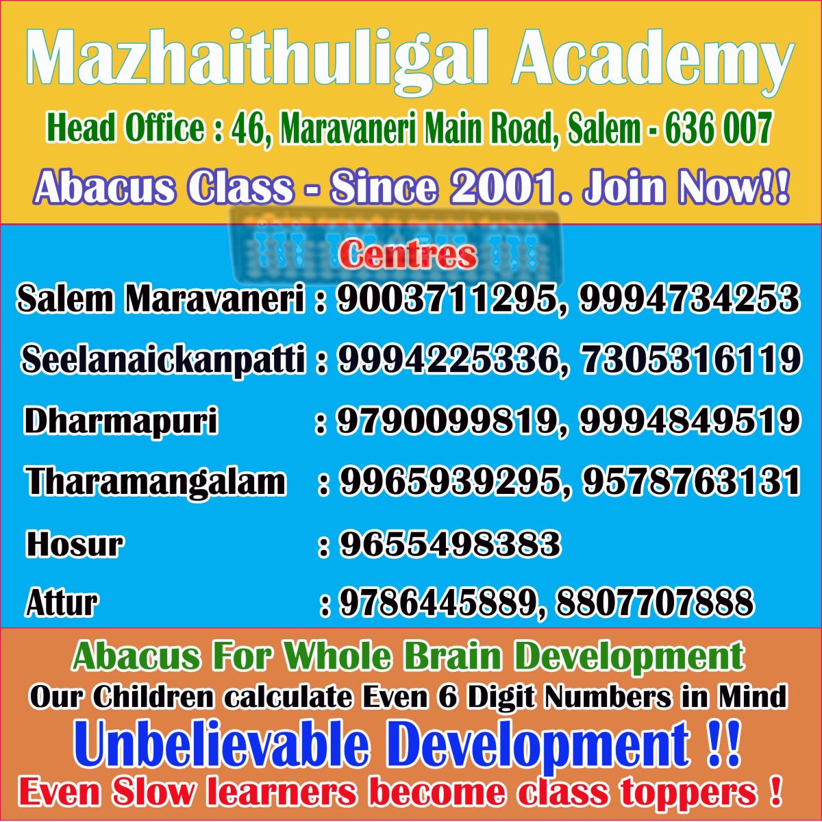 “With a 25-year legacy of excellence, Mazhaithuligal Academy is Indiaโ€™s premier centre for Abacus training and Mental Arithmetic. We specialize in transforming young minds through our scientifically proven Abacus and Memory Techniques programs, designed to boost Memoy , Concentration, Visualization, speed in Mental Calculations, Excellence in Studies and confidence in children. As pioneers who introduced live online Abacus classes during the 2020 lockdown, we offer both interactive online and personalized offline sessions across our branches in Salem (Head Office), Dharmapuri, Tharamangalam, Seelanaickanpatti, Hosur and Attur. Whether your child is a beginner or advanced learner, our expert trainers provide a supportive environment for holistic brain development. Join the Mazhaithuligal family to give your child a competitive edge today!”